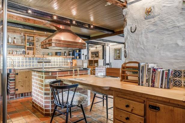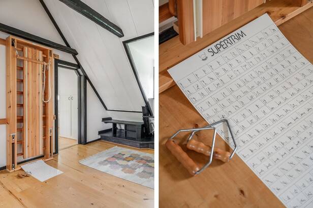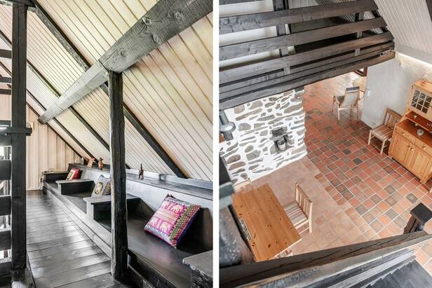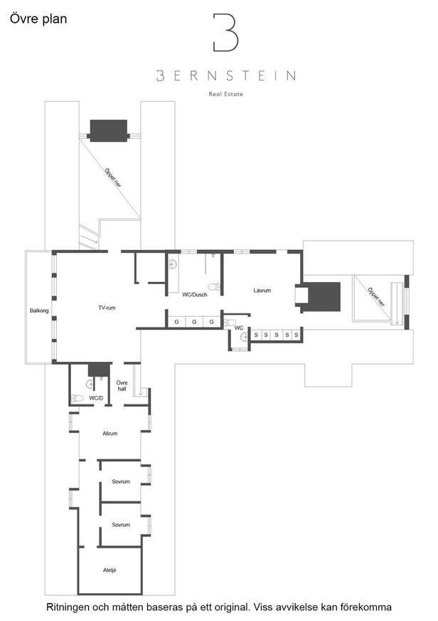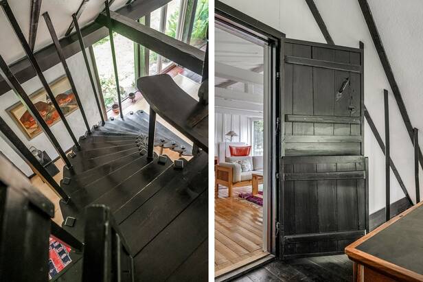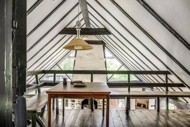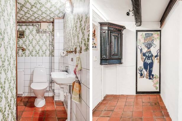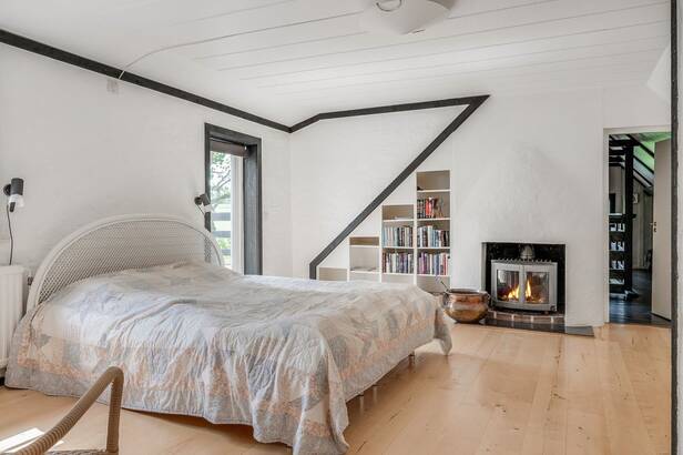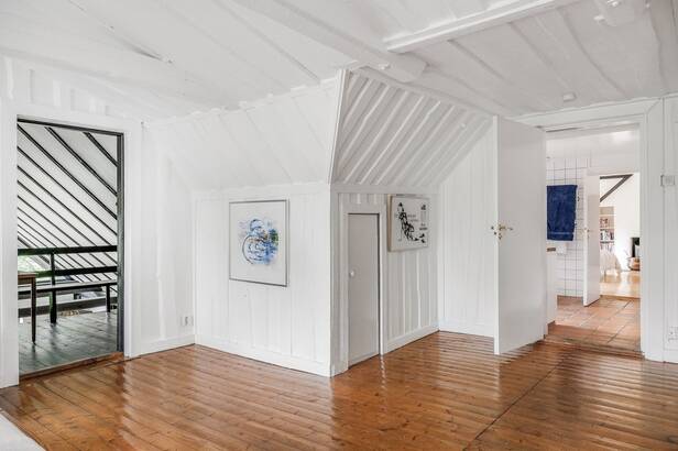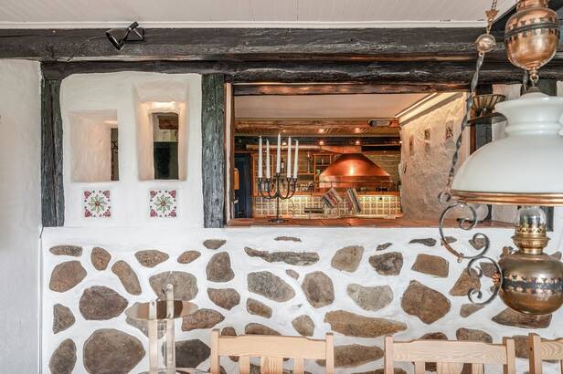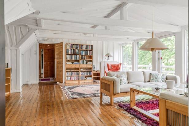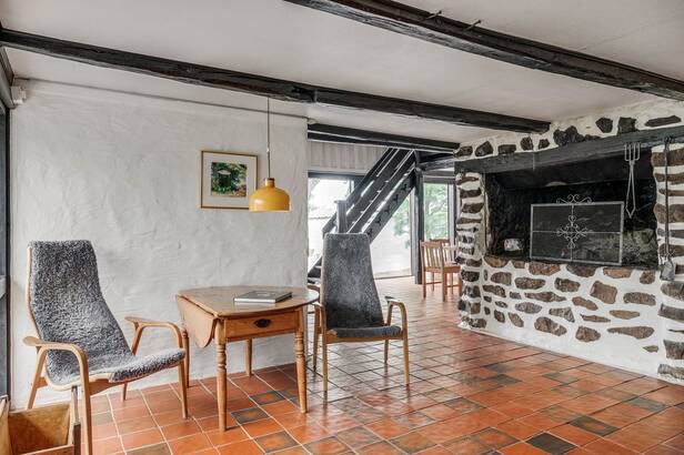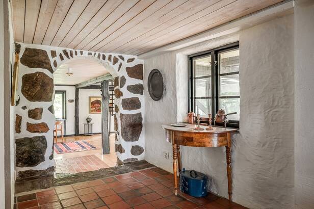Hemmets interiör präglas av lyxig 50-tals stil. Interiör och materialval är av dåtidens mest exklusiva. Sten och trägolv. Allt mycket smakfullt avvägt och en iögonfallande sällskapsdel med eldstad, högt till taknock och flertalet fönsterpartier samt trappa som leder upp till Katjas ateljé, utgör hemmets centrala plats. Kök med matplats och synliga murstockar samt murad spis. Skräddarsydda förvaringslösningar såväl som genomtänkta rumsindelningar. Flertalet glaspartier släpper in ett vackert ljus i hemmet och vetter ut mot fastighetens ägor. Planlösning i två plan och totalt antal rum är 10 varav sovrum 5. Möjlighet till separat gästdel och egen ingång. Fyra badrum samt wc. Källare samt tvättrum.