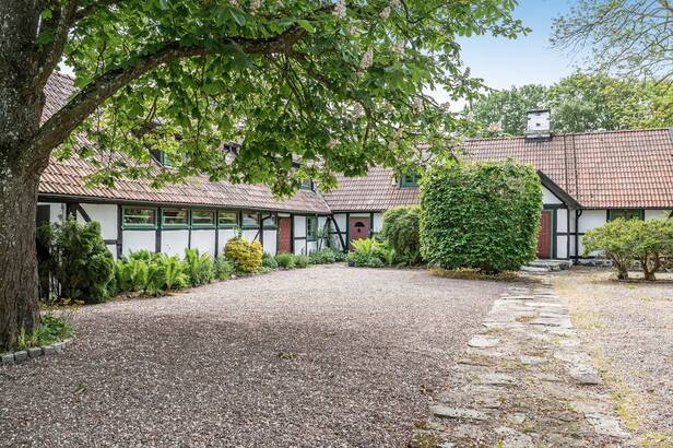 Den pittoreska gården ligger inramad av en vit mur och består av två enheter, gårdsbyggnad med tillhörande garage, stalldel om dryga 70 kvm och med en trädgårdstomt om ca 6000 kvm samt en större markyta om ca 2 hektar. Fastighetsbeteckningarna är Huaröd 6:21 och 6:29. Den skånska gården är byggd i en klassisk L-formation, med rofylld innergård och utgörs av 2 plan. Fasaden är av korsvirke. På baksidan återfinns en pool med poolhus av sedum med utekök och grill.