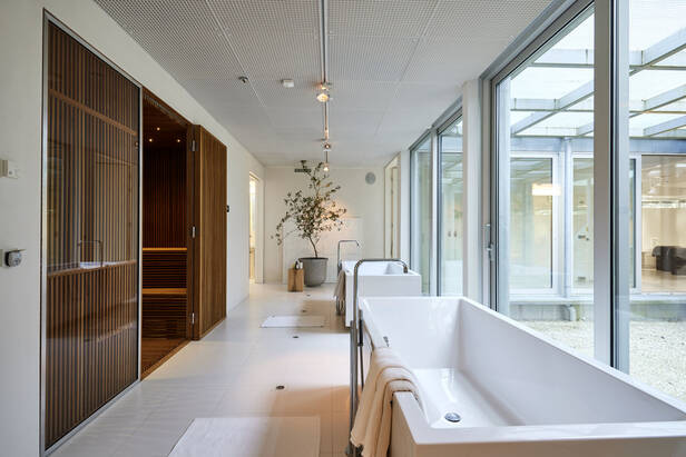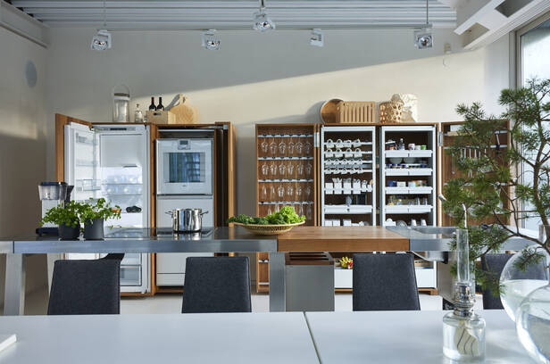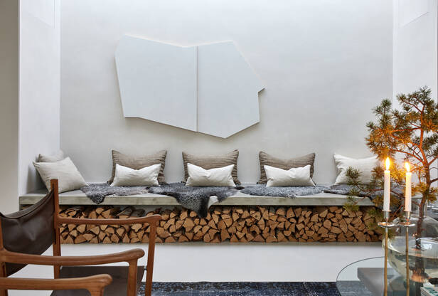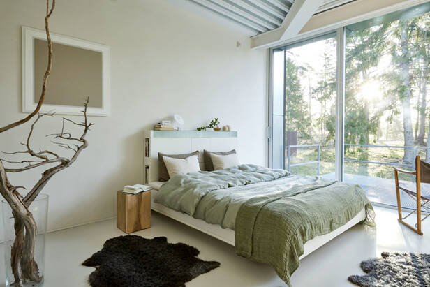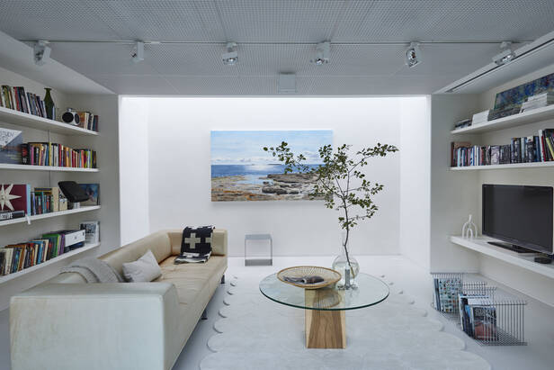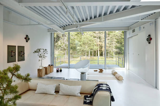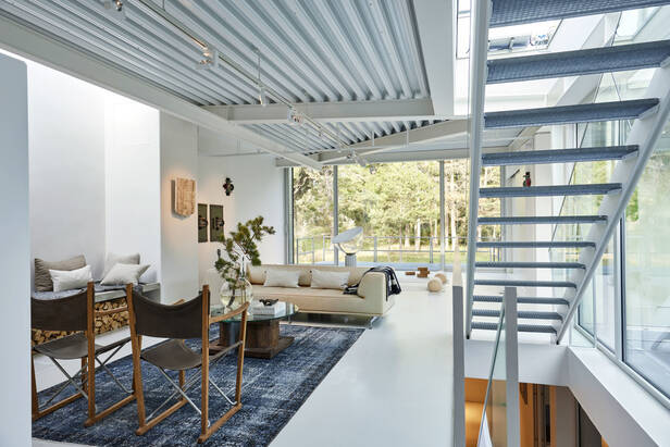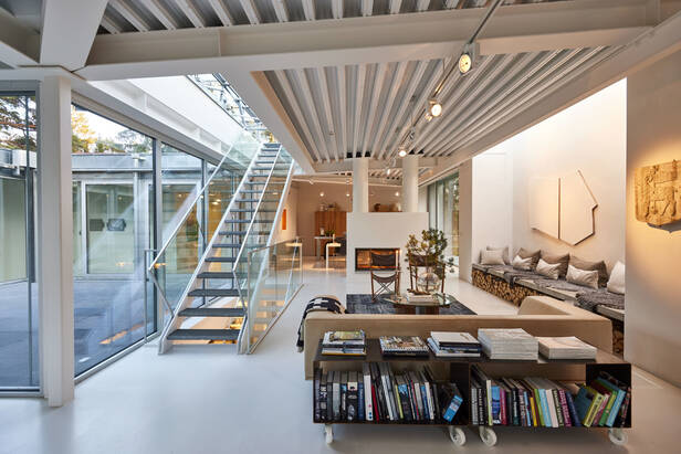 Den slutna fasaden kan öppnas upp genom att hydrauliska bryggor fälls ut - som kronbladen på en vaknande blomma - och förvandlas till terrasser. Inuti väntar tomma rum på att fyllas av liv, idéer, verksamhet. Här finns allt som kan hjälpa till att föda tankar och gestalta dem - traversen i ateljétaket är ingen dekoration, snarare en uppmaning. Materialutrymmen, sovrum, bastu, kök, bibliotek och källarvåningens öppna volymer står beredda att ta emot sina gäster och deras önskningar. Här kan man bara njuta och koppla av, äta goda middagar och husera gäster och fester.