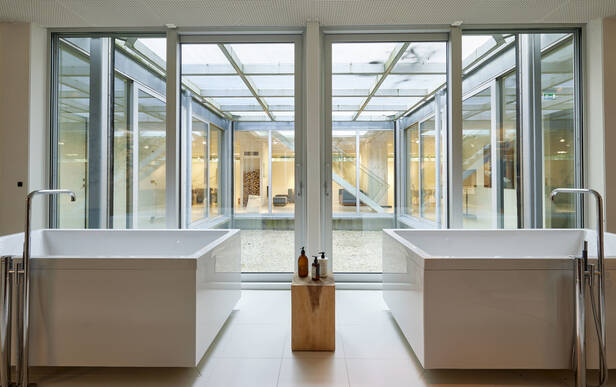 Hela byggnaden kan skifta mellan öppenhet och avskildhet, med avdelade skjutdörrar, flyttbara fonder, halvtransparenta gardinvåder och de enorma glasytorna som kan göras helt ogenomträngliga med hjälp av de upp- och nedfällbara fasadbryggorna om arbetet och humöret så kräver. I husets atrium finns en höj- och sänkbar plattform vars förzinkade gallergolv silar ljuset till mattare strålar. I sitt högsta läge bildar plattformen takterrass, i mitten- eller bottenläge en omsluten plats.