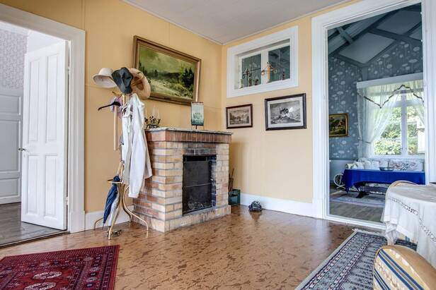 Via verandatrappan, når vi in i huvudbyggnaden. Denna utgörs av två plan plus det centralt placerade tornrummet. Total yta om ca 175 kvm. Nedre planet är hemmets samlingsplats, där flera sociala tillställningar ägt rum under årens lopp. Vardagsrum, blå rummet som utgör matsal, rökrum, samlingsrum, kök och det gamla pigrummet ryms på planet. Centralt placerad eldstad. Köket är mindre, målat i en vacker turkos färg. Utgång till husets baksida och den ekologiska MullToan.