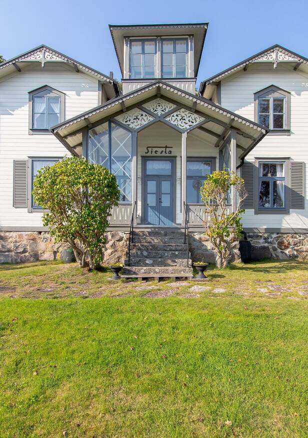 Det vackra huvudhuset lyder under namnet Siesta, som har sitt ursprung från svensk snickarglädje, anno 1878. Ett flertal originaldetaljer finns kvar. Tillbyggnad skedde under 1900-talets början. Underbar träfasad, välsvarvat och målat i vit och blå nyans, med iögonfallande tornrum. Gästhus ner mot vattenbryn. Intilliggande större brygga. Fastigheten, med en total area om 1600 kvm, är inramad med mur och stensättning. Tidigare utgjorde marken även en tennisbana och inspirerad av den svenska tenniskungen Gustaf den V. Vackra blomster i alla dess former går att finna i den parkliknande trädgården, då dessa trivs i det milda klimatet.